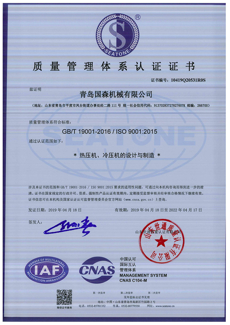 青岛国森机械有限公司是国家高新技术企业、青岛市创新型企业,ISO9001质量管理体系认证企业,是重组材产业国家创新联盟发起单位、国际林产品可持续发展创新联盟理事单位、木竹产业技术创新战略联盟和竹藤产业发展创新驱动联盟成员单位、国家竹藤工程技术研究中心实验基地。 国森以“立足科技创新、共创美好未来”为发展方针,注重新技术、新产品研发,拥有16项授权发明专利,43项实用新型专利和1项国际领先水平成果,参与制定2项国家标准和2项行业标准,曾获2015年度国家科技进步二等奖、2020年度北京市科技进步二等奖、2015年度中国林业产业创新奖、2015年度河北省科技进步奖、2014年度北京市科学技术奖、2010年度平度市科技进步奖等荣誉。 国森建立了以企业为主体、市场为导向、产学研相结合的技术创新体系,与中国林科院、国家竹产业研究院、国际竹藤中心、南京林业大学、东北林业大学、四川农业大学、湖北省林科院、湖南省林科院、广东省林科院、大连理工大学、山东省林科院、四川大学、原国家林业局北京林业机械研究所等科研机构合作,承担“十四五”和“十三五”国家重点研发计划项目、国家科技型中小企业技术创新基金项目、国家林业公益性行业科研专项项目、青岛市产业振兴专项资金扶持项目、青岛市创新型中小企业培育计划等项目。 “国森”品牌产品主要有竹集成材(竹地板、竹工艺板、竹家具板、竹菜板等)压机、重组竹成套设备、重组木成套设备、冷藏车/房车/方舱大板热压机、全自动淋胶机、碳纤维板热压机、铝(纸、塑)蜂窝板压机、铝蜂窝芯拉伸机、贴面热压机、曲面成型设备、工业纸板压水机和热压机、竹凉席压布机、竹(木)胶合板压机、层积材(LVL)设备、蛭石板生产成套设备、防火板压机、绝缘板压机、木塑板压机等及配套设备,涉及冷链、轨道交通、生物质速生材应用、航空、家具、建材等多个行业领域。产品销往全国各地,并出口美国、哥伦比亚、日本、韩国、加纳、马达加斯加、欧洲、非洲、东南亚、南亚、西亚和中东等24个国家和地区。 |